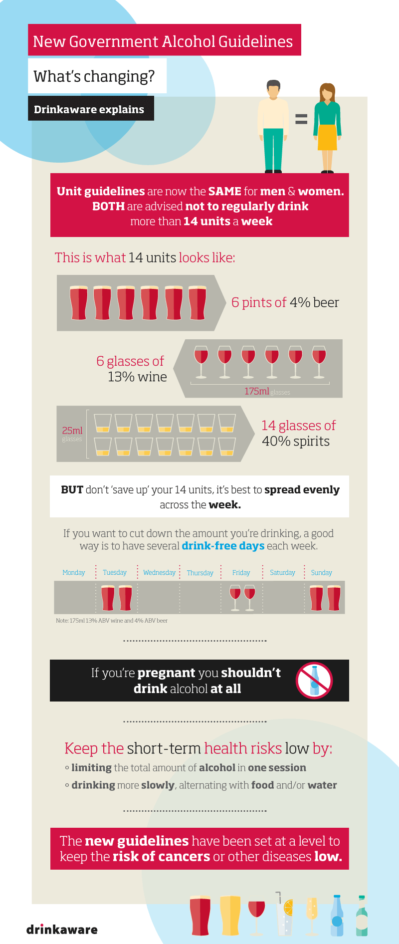 To keep health risks from alcohol to a low level, the UK Chief Medical Officers (CMOs) advise it is safest not to drink more than 14 units a week on a regular basis. The CMO also give guidance on drinking in pregnancy and single occasion drinking.